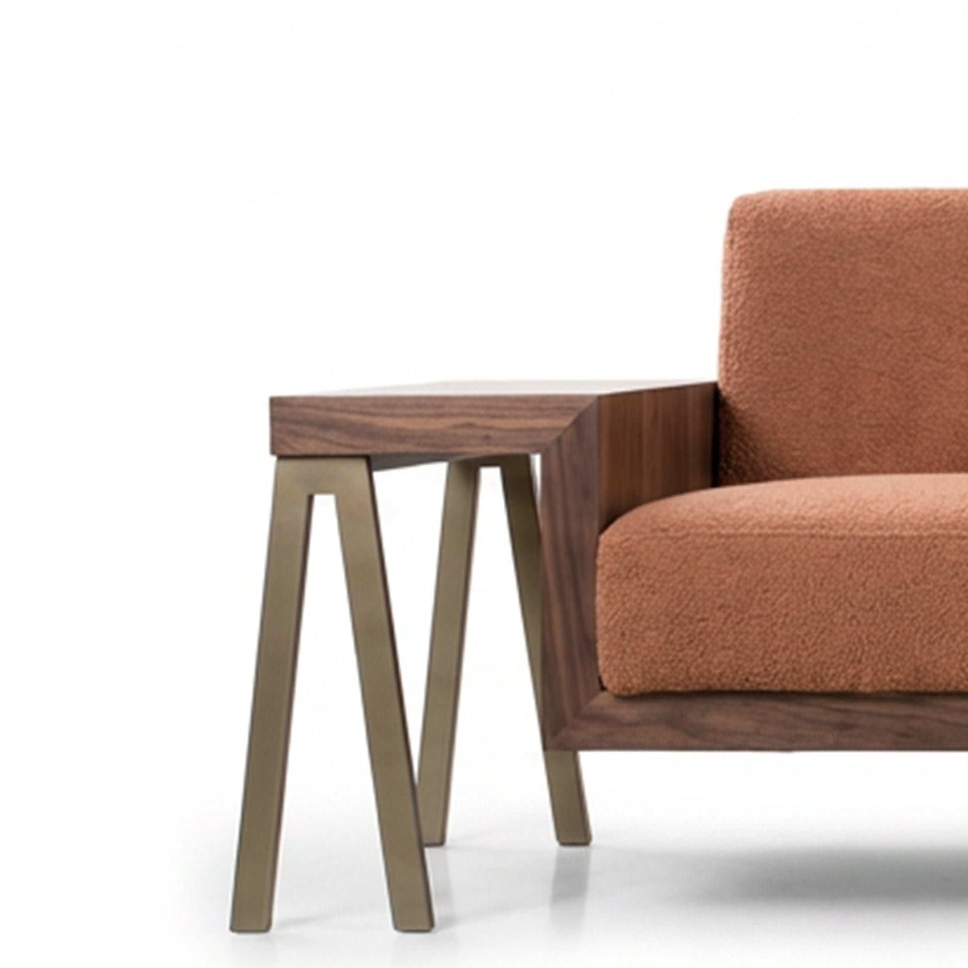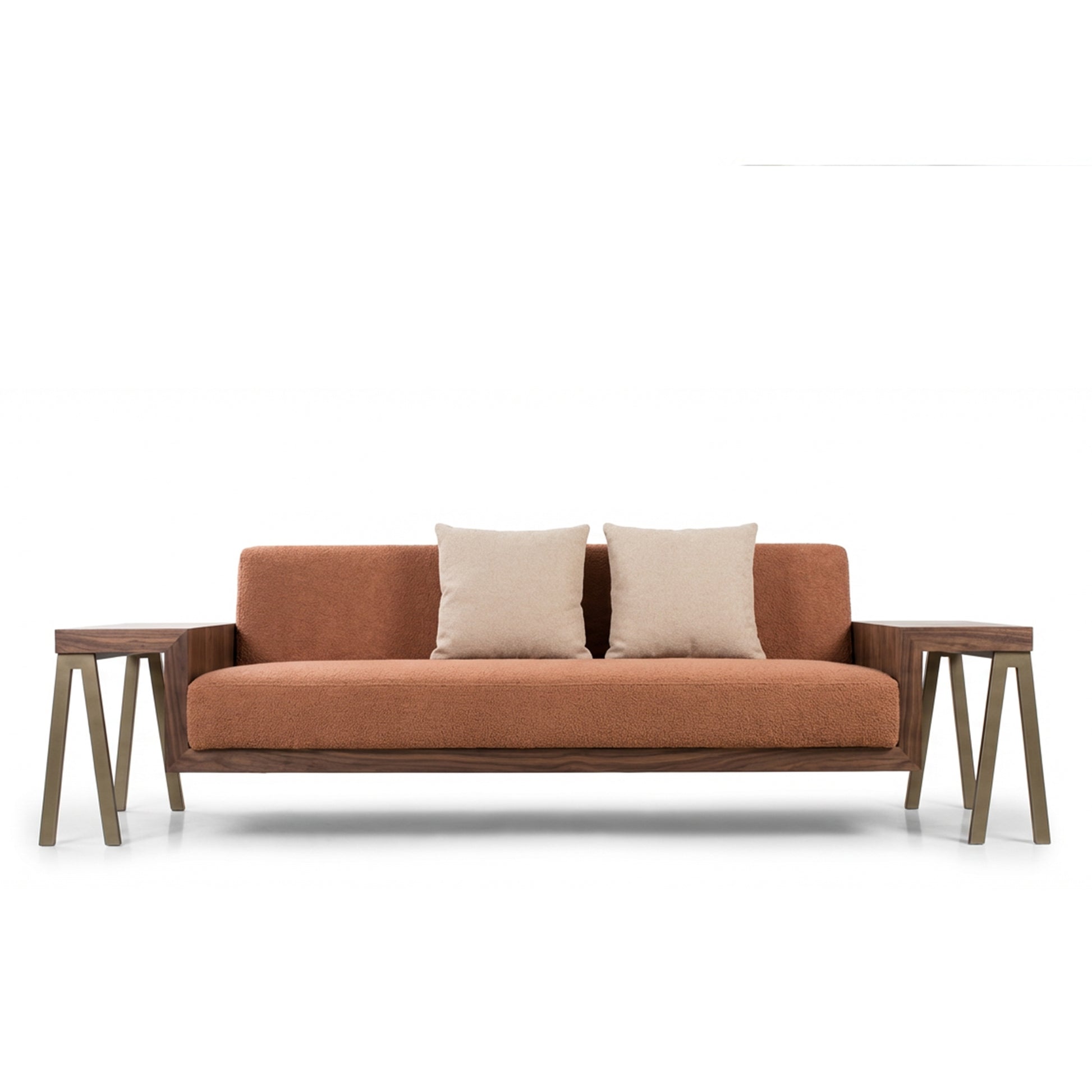 Rigorous and charming David brings comfort and support together, leaving you weak at your knees and ready to dive into softness. Thick wooden frame appears robust and weightless at the same time: resting on slender steel legs, lifted from the floor with no visible supports it creates sophisticated and powerful line. Deep arms form side trays for your book, tablet or a cup of coffee, making this sofa a multifunctional centerpiece of living space or an office suite.
