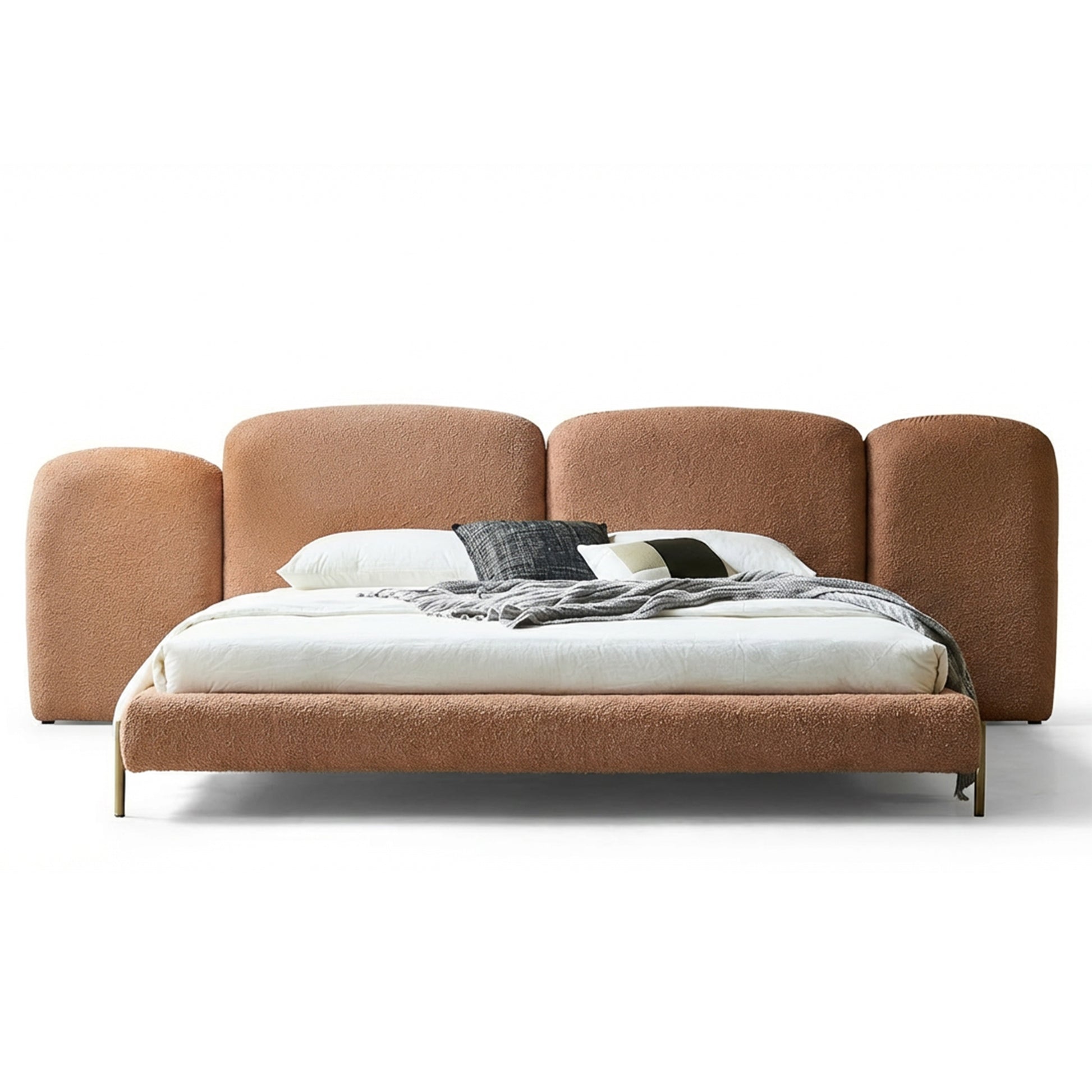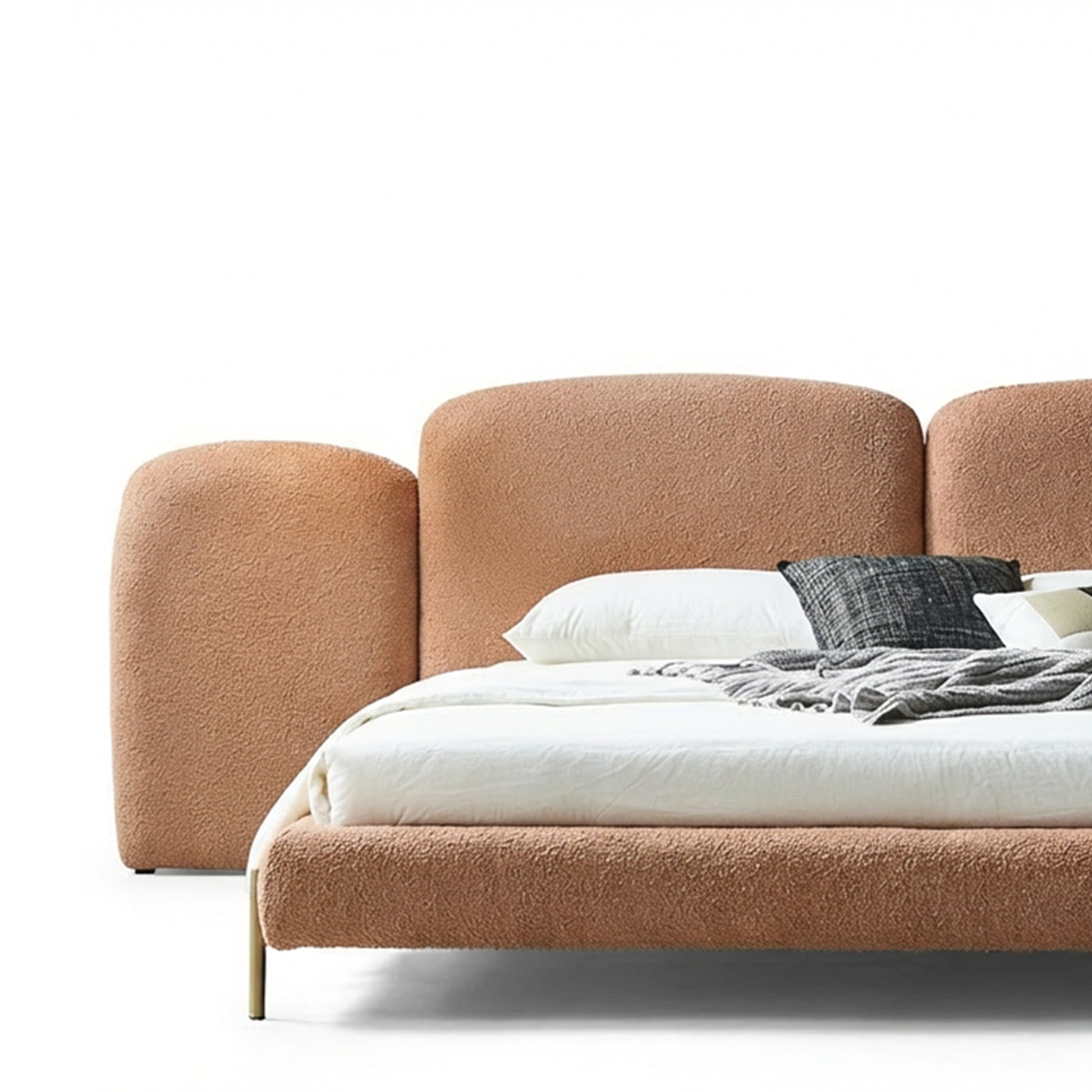 The bouclé fabric introduces a natural, earthy tone that feels both contemporary and timeless. Combined with clean lines and carefully considered details, this bed becomes a central element of a serene and elegant sleeping space.