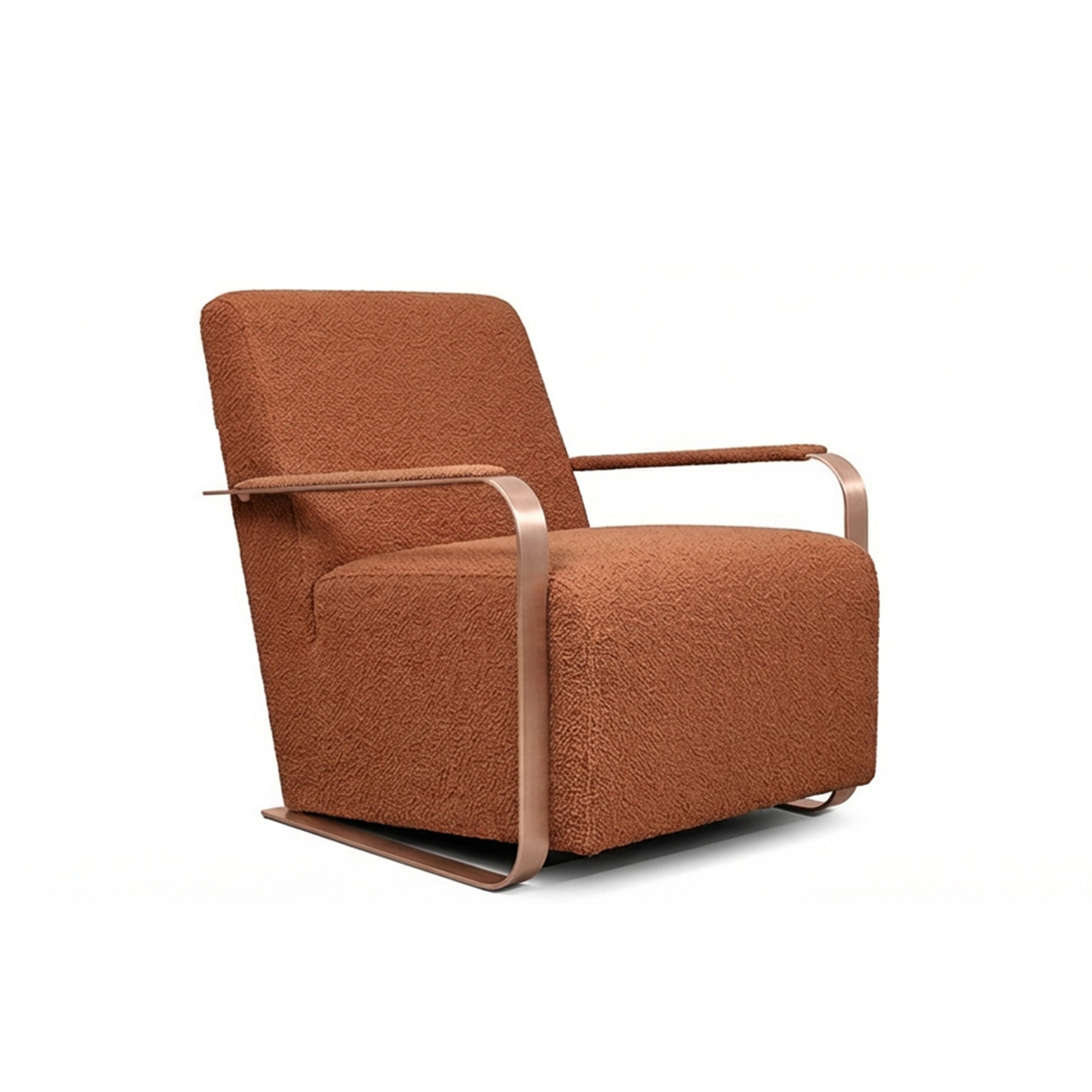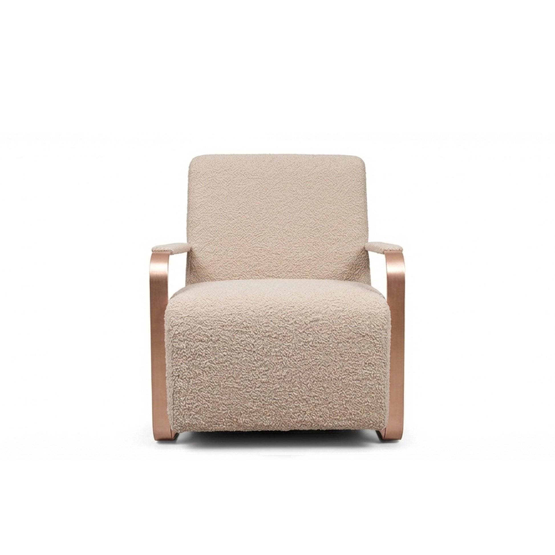 Fully upholstered in bouclé fabric, the armchair offers a warm, tactile seating experience. The contrast of rose gold metal details adds a subtle sense of luxury while preserving a clean, contemporary expression.